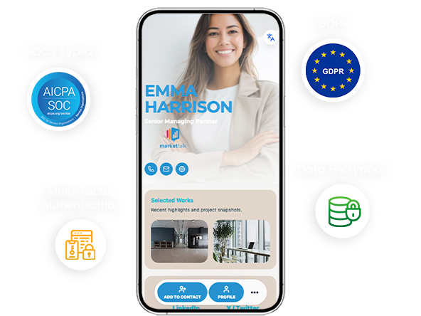 Protect your data, teams, and digital business cards with certified infrastructure, strong encryption, and secure access controls.