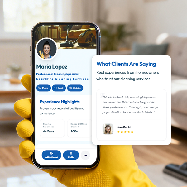 Show your services, pricing options, team information, and contact details in a polished digital card built for cleaning teams.
