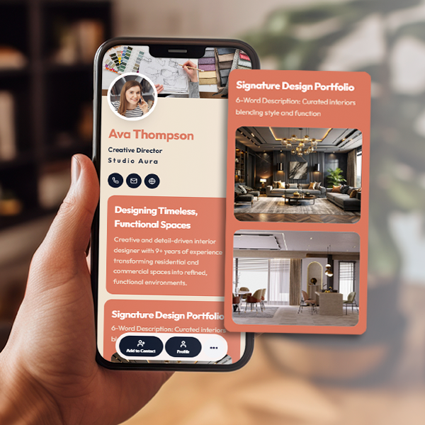 Showcase your design aesthetic, project gallery, and contact details in one elegant digital card.