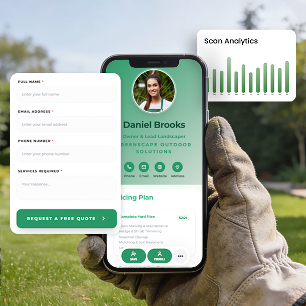 Share your services, project links, estimates, and contact details in a simple digital card designed for landscapers.