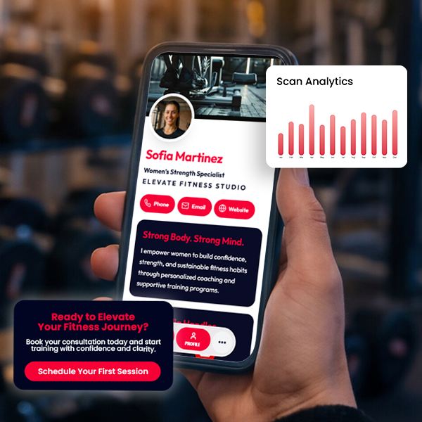 - Digital business cards with booking links and contact actions